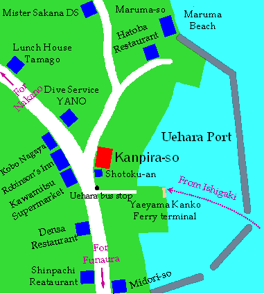 Kanpira-so is located at the center of Uehara Village, where is very convenient because with some souvenir shops, supermarkets and diving services. Also, Kanpira-so faces the sea, having some ocean-viewed rooms upstairs.