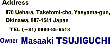 | The owner is not called with his true mane in Iriomote, but always called Mr. Shotoku. Because he used to have an beard face in the old days like Shotoku-taishi, who is a great man in the Japanese ancient history. Although he was from Osaka, already he has been living in Iriomote more than 20 years, now he also he works as the principal of the Urauchi Community Center. As he used to work for Kanpira-so in the far old days, having a deep relationship to Kanpira-so. There is a beach called "Shotoku Beach" a little ahead of Maruma Beach. He has a hobby to swim, he trains his body by swimming in the sea every day. | |