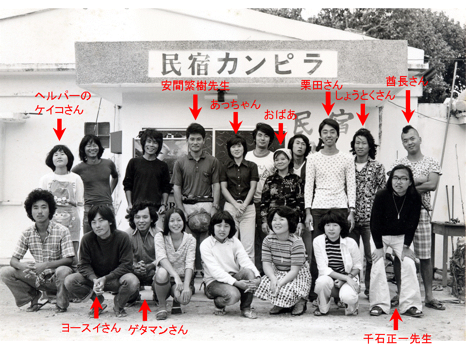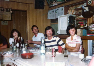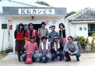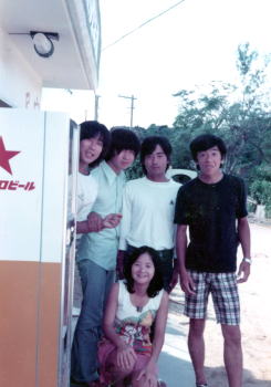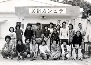 1975年11月、船浦でのスナップ。洋子さんの両隣の女性はどちらも“あっちゃん”だそうです。うしろに立っているのがヨースイさん、右端はマグジョさん。(徳島県在住のヨースイさん提供)