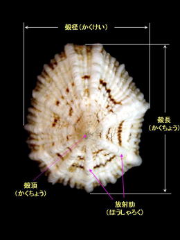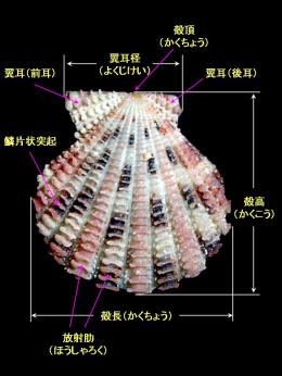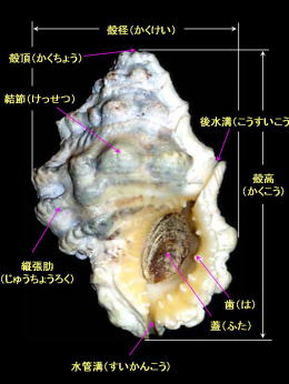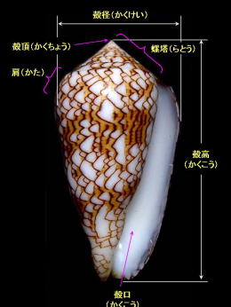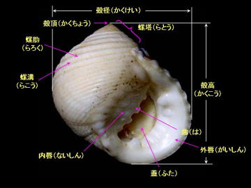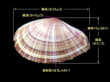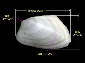 二枚貝で、殻の前端から後端までで最も長い直線距離。笠型の貝では殻の前後で最も長い直線距離。巻貝の場合は殻長という項目はないが、殻高のことを殻長とする場合もある。 |
