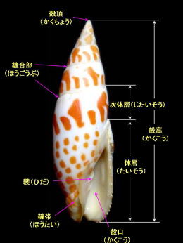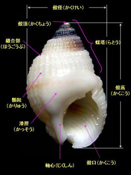 巻貝の殻は、基本的に一本の管がある軸のまわりに巻いたものである。この管を螺管(らかん)といい、殻を正面から見たときの螺管の重なりを螺層(らそう)という。螺塔は、殻口より上の高くそびえる螺層のことをいい、厳密には次体層から殻頂までの部分である。 |