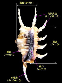 棘よりさらに顕著な太い突起で、スイショウガイ科のクモガイ亜科やスイジガイ亜科などの貝にみられる。 |