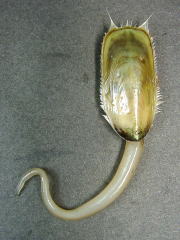 巻貝のうち、進化的な貝類では殻口の下端(前端)に管状の溝が形成され、ここに入水管が入る。この溝を水管溝といい、種によっては水管溝が棒状に非常に長く伸びる。 |