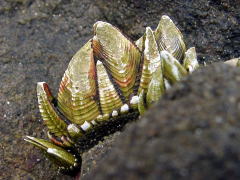 二枚貝の左右の殻を結合しているちょうつがいの部分。殻の外側にある種と内側にある種がある。 |