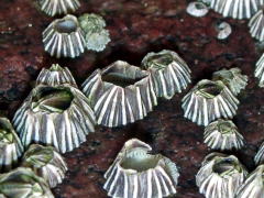 二枚貝で、殻頂から放射状に広がる顕著な畝(うね)状の隆起線。笠型の腹足類でも放射肋を持つものもある。 |