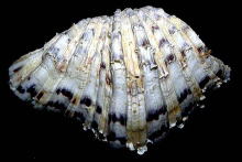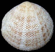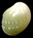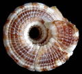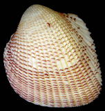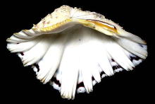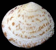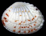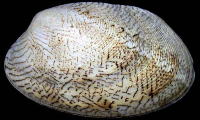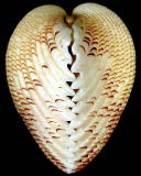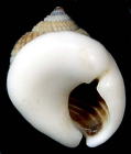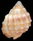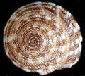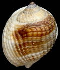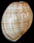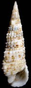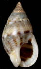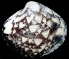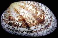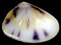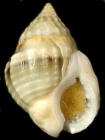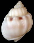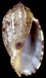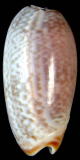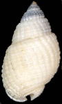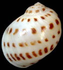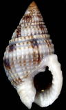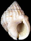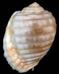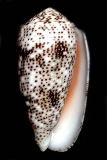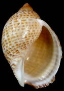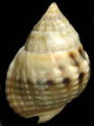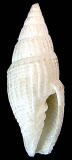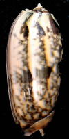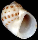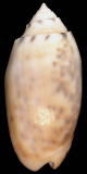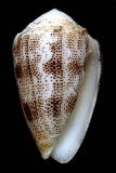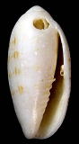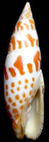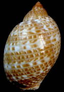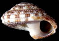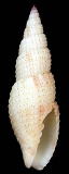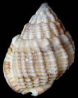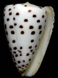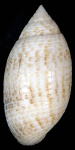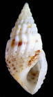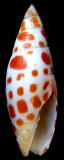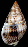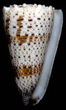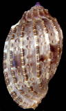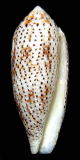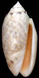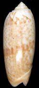 | 殻高4cm以下の小型のイモガイ。殻は樽形で、殻の側面は丸みが強い。螺塔は非常に低く、肩はやや丸い。肩部には結節が並ぶ。殻底部に数条の弱い螺条が走る。殻口は狭く、細長く開く。殻色は、白色の地に暗色の波状縦帯と、体層に2条の暗色帯があり、それらの色帯の中には細かい黒点が密に分布して、あたかも点描画のようである。礁池内の砂地に生息する普通種で、完全に砂に潜っている。 |