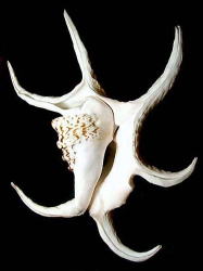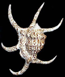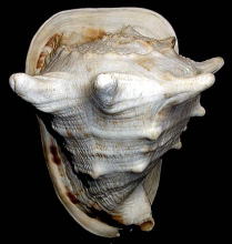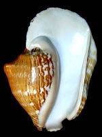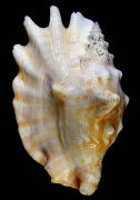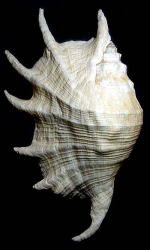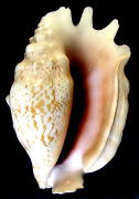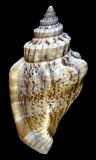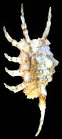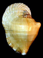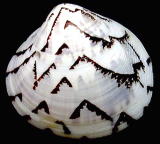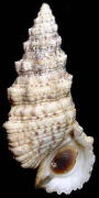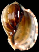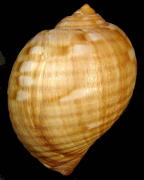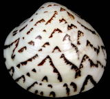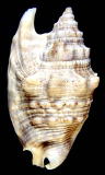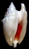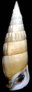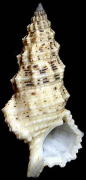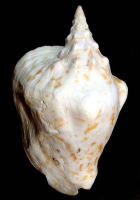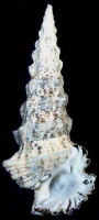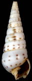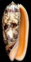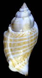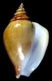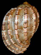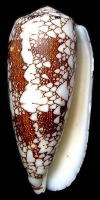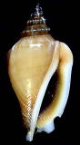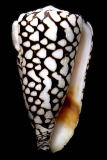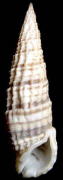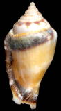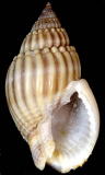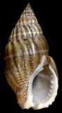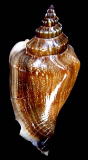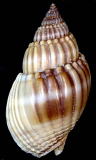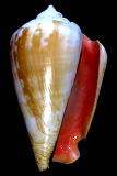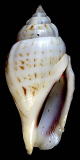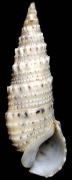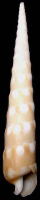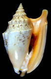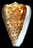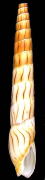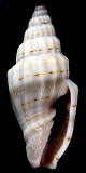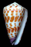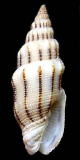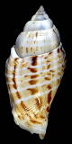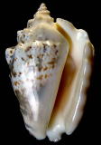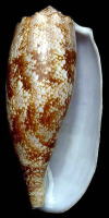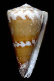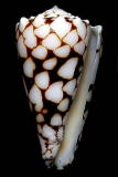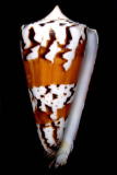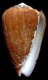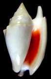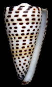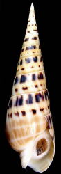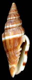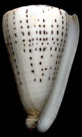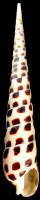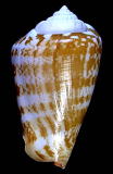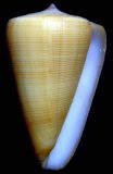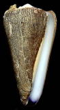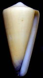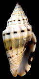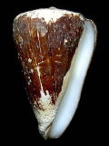 | 別名ロウソクイモ(ロウソクガイと紛らわしいが)。殻高7〜8cmの中型のイモガイ。殻は整った逆円錐形で、殻の側面は直線的で、肩が張る。殻頂部はほとんど平坦だが螺塔が顕著に突出する。肩と縫合の間はU字型の浅い溝になる。殻表はほとんど平滑だが、殻底部にわずかに螺肋が認められる。殻口は非常に狭く、直線的で細長く開く。殻に色は茶褐色と白の色帯が交互にあり、白色帯の中には茶褐色の稲妻模様が走る。殻底部は殻口内も含めて黒く彩られる。砂地のアマモ帯などに生息し、場所によっては普通にみられる。 |