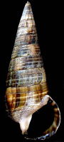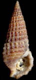 | 殻高2〜2.5cm。殻は長紡錘形。螺塔は著しく高くそびえ、先端は鋭く尖る。殻には縦肋と螺肋が規則的に走り、殻全体が格子状彫刻で覆われる。体層の背面と腹面の境界には縦張肋が認められる。外唇は肥厚し、水管溝はほとんど形成されない。殻色は一様に赤褐色。マングローブ林の泥上やそれに連なる干潟の砂泥上に生息する。場所によっては普通にみられる。 |