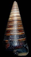 | 殻高10〜12cm。殻は円錐形で、螺塔は著しく高くそびえる。上方の螺層には太い縦肋があるが、下方になるほど弱くなって畝(うね)状になる。殻には細い螺溝が走り、殻底部で特に顕著である。体層の背面と腹面の境界には太い縦張肋がある。体層はよく膨れ、殻口外唇は反転する。水管溝がわずかに認められる。蓋は革質で薄く、少旋型。殻色は茶褐色〜暗茶褐色で、淡色の螺条が出る場合もある。マングローブ林の泥上に生息し、特にマングローブの根の周囲に群生している。 |
