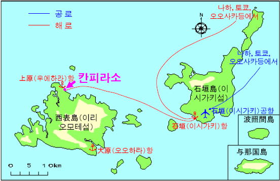 서울(인천)에서는 아시아나 항공으로 오키나와(沖繩)의 중심도시인 나하(那覇)에 직행편이 있습니다. 그 밖의 노선으로는 서울, 부산, 제주로부터 후쿠오카(福岡) 또는 오오사카(大阪)(칸사이(關西))를 경유하여 나하에 이릅니다. 나하에서 비행기를 갈아타고 이시가키(石垣)에 도착(소요 약50분). 오오사카(칸사이)와 후쿠오카에서는 이시가키 직행편도 있습니다. 또 오오사카와 후쿠오카에서는 여객선(ferry)을 타고 나하를 경유하여 이시가키항에 도착.