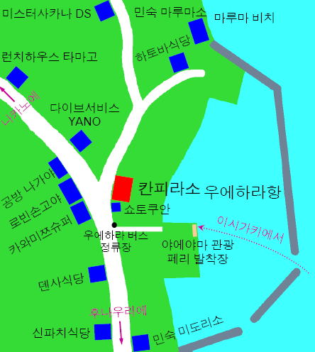 칸피라소는 이리오모테에서 가장 번화한 우에하라 부락의 중심지이고, 주변에는 선물 가게, 슈퍼 마켓(super market), 다이빙 서비스(diving service)등이 많이 있어서 대단히 편리합니다. 또한, 칸피라소의 바로 뒤는 바다로, 숙소 이층에는 바다가 보이는 방도 있습니다.