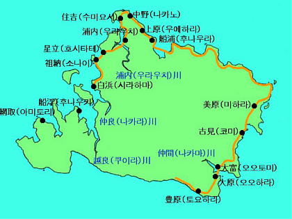 이리오모테섬에 현존하는 부락은, 주회도로에 따라 남쪽에서, 토요하라(豊原), 오오하라(大原), 오오토미(大富), 코미(古見), 미하라(美原),후나우라(船浦), 우에하라(上原), 나카노(中野), 수미요시(住吉), 우라우치(浦內), 호시타테(星立 (干立)), 소나이(祖納 (租納)), 시라하마(白浜)이 되어 거기에서 도로는 도중에 끊어지지만, 그 앞에 후나우키(船浮), 아미토리(網取)가 있습니다. 이 중 토요하라에서 미하라 까지를 동부, 그것보다 서쪽(북쪽)에있는 부락을 대개 서부라고 부릅니다. 일찌기는 동부와 서부를 연결하는 길이 없고, 같은 섬이면서 배로 오가고 있었다고 하지만, 1977년에 드디어 북안도로가 개통해서 동부와 서부가 연결되었습니다.