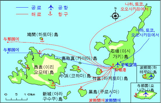 | 야에야마(八重山) 제도에 있는 많은 섬과 교통 |