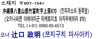 | 오너의 쯔지구치 님은 본명으로 불리지 않고 거의 쇼토쿠 님라고 불립니다. 왜냐하면, 옛날, 聖德太子(쇼토쿠타이시=성덕태자) 같은 수염이 많은 얼굴이었기 때문이랍니다. 오오사카(大阪) 출신이지만 이리오모테 섬에 정착해서 이미 20년이상, 지금은 우라우치(浦內)부락의 공민관장으로서도 근무하고 있습니다. 예전에 오랫 동안, 칸피라소의 헬퍼(helper)을 하고 있었던 적도 있어서, 칸피라소와는 친숙한 사이입니다. 마루마 비치의 가까운 곳 에는 오너의 이름과 관련된“쇼토쿠 해변”이라고 하는 비치가 있습니다. 수영이 취미이고, 매일 빠짐없이 바다에서 헤엄치며 몸을 단련시키고 있습니다. | |
